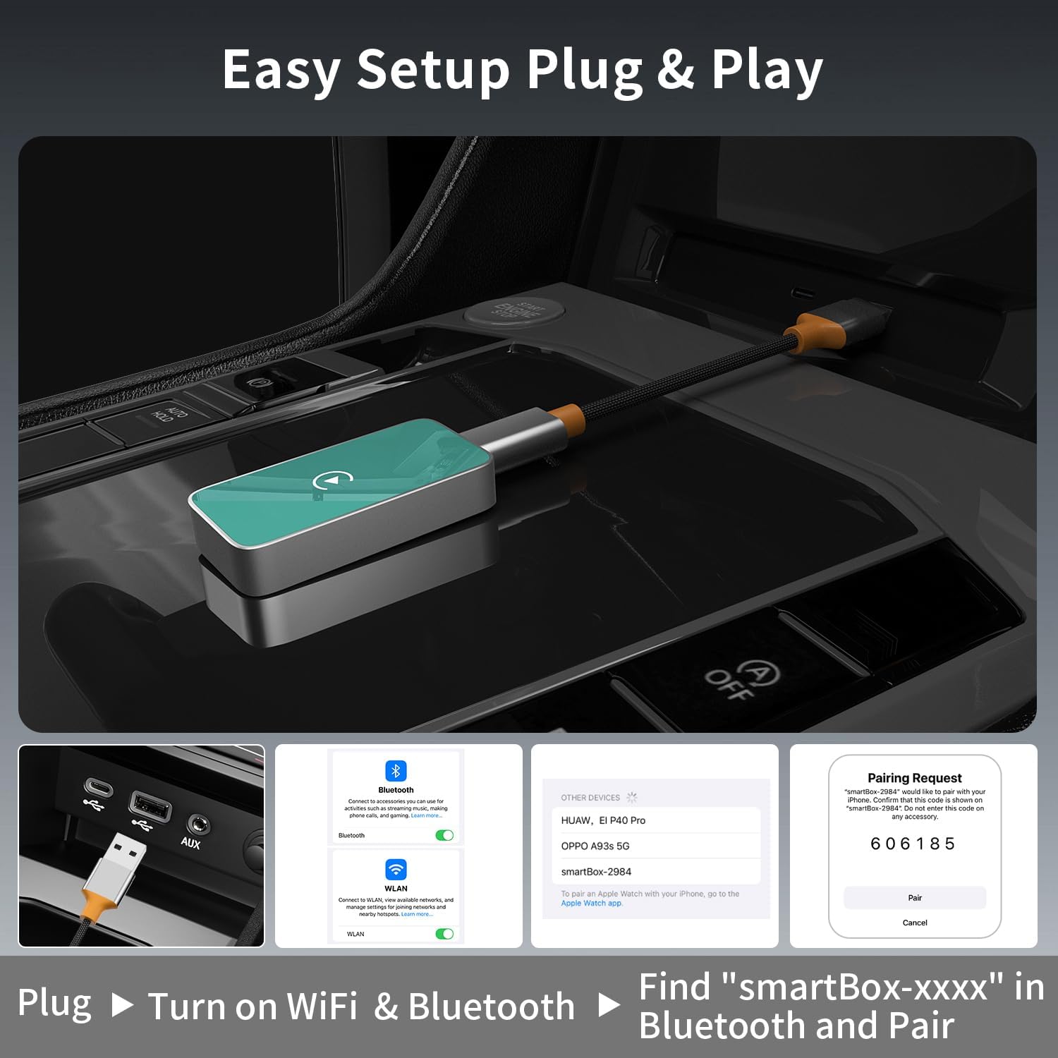 【Plug and Play】: Open your phone’s WiFi and Bluetooth, plug the adapter into your car, then the device Bluetooth name “Smartbox-xxxx” will show up on car screen or you could search to find it on phone. Tap to connect, then you could enjoy it now. Super simple to connect, no complicated setting, plug and play.