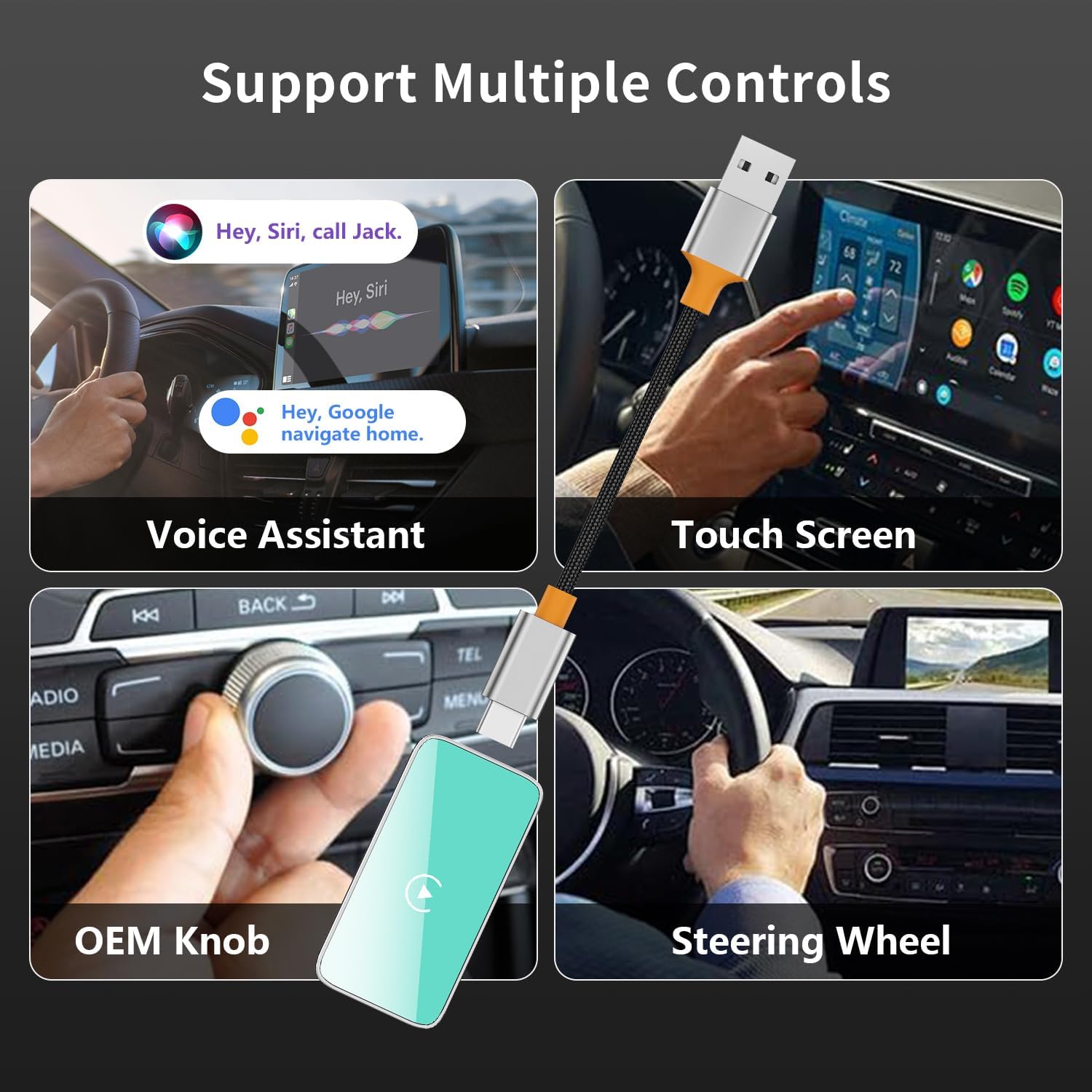 【Multiple and voice control】:This car play adapter support all original controls like OEM Knob, wheel control, screen touching and voice control. Every one in car can enjoy it.