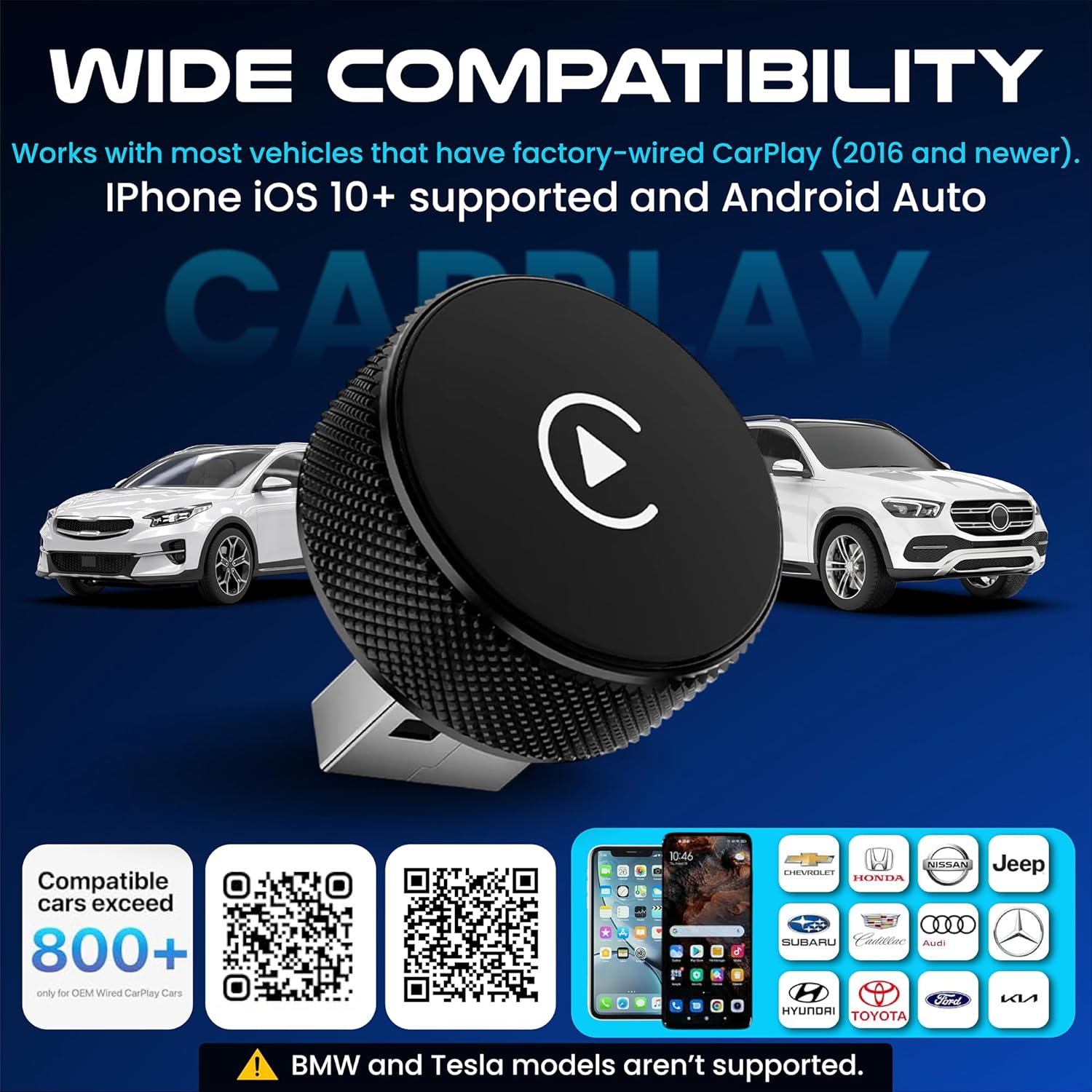 【Wide Compatibility (Check Before Buying)】Works with 98% of vehicles equipped with factory-wired CarPlay or Android Auto. Supports iPhones running iOS 10+ and Android devices on Android 11+. Includes USB-A to USB-C converter for universal port support. (Note: BMW and Tesla models not supported; streaming apps like Netflix/YouTube are not available.)