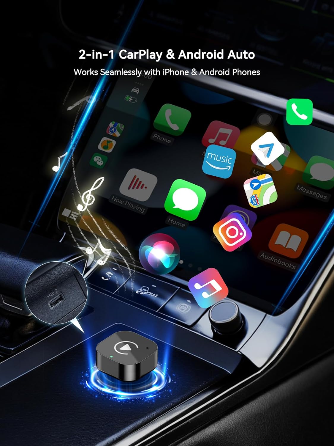 【2-in-1 Wireless CarPlay & Android Auto Adapter】Upgrade any factory wired CarPlay or wired Android Auto system to wireless CarPlay and wireless Android Auto instantly, supporting navigation apps, calls, messages, and music streaming without plugging in your phone, suitable for cars, RV dashboards, and certain Marine Antenna infotainment environments