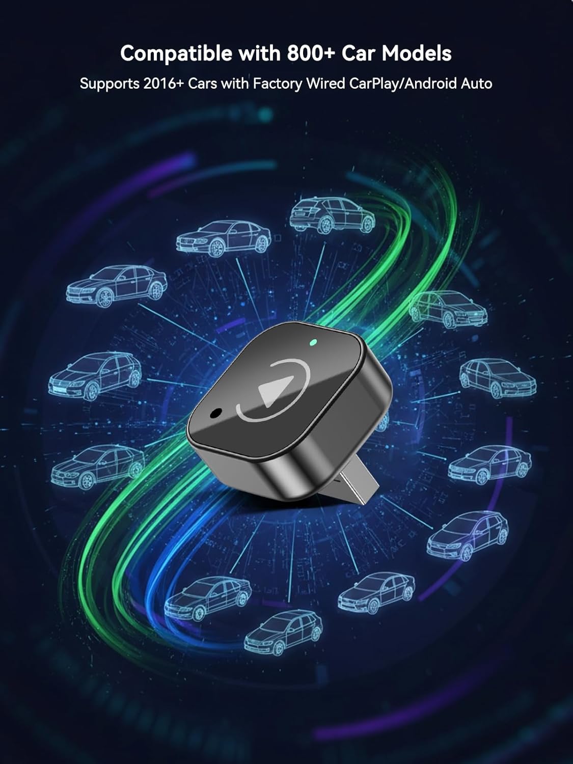 【Broad Compatibility with 800+ Car Models】Supports for iPhone iOS 10+ and Android 11+, compatible with vehicles that have factory wired CarPlay or wired Android Auto (2016 and newer), including Toyota, Honda, Ford, Nissan, Hyundai, Kia, Mazda, Chevrolet, and more (not for Tesla, BMW, Volvo, or vehicles without wired CarPlay)