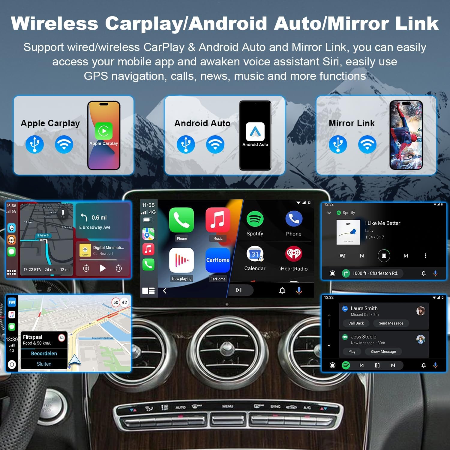 Supports Wireless/Wired CarPlay & Android Auto-Compatible with both wireless and wired connections. Works with Siri, Maps, Music, Phone calls, Waze, Sygic, iTunes, Apple Music, and more. Allows access to messages