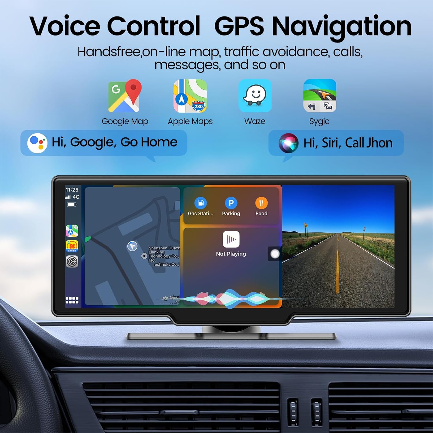 Wireless Apple Carplay & Android Auto; 10.26 inch IPS HD Screen;2 Kind of Strong Suction Cup Bracket;Full Angle Screen Adjustment Available; Universal for All Cars;Screen Resolution 1600*600P;Airplay/Android Cast; Upgraded 5.3 Bluetooth;Support Voice Control;Real-time Map Navigation;