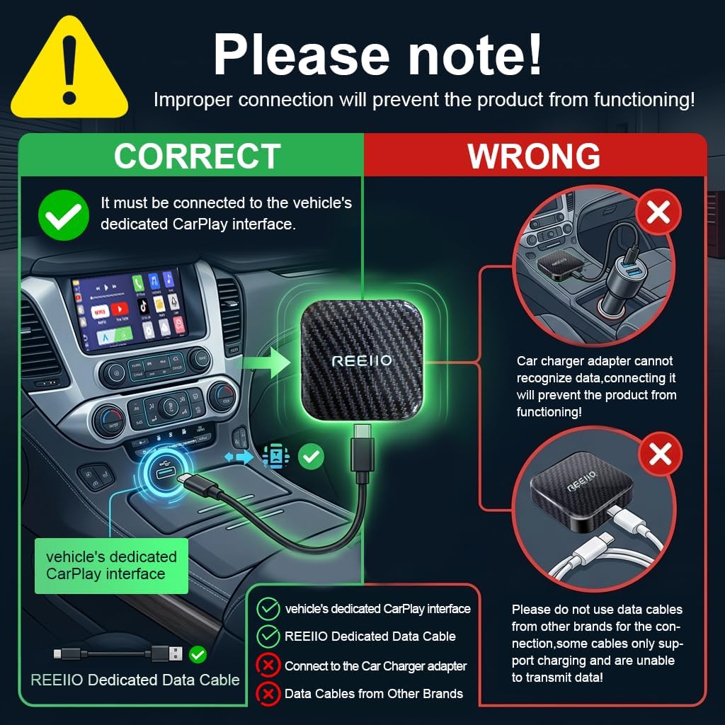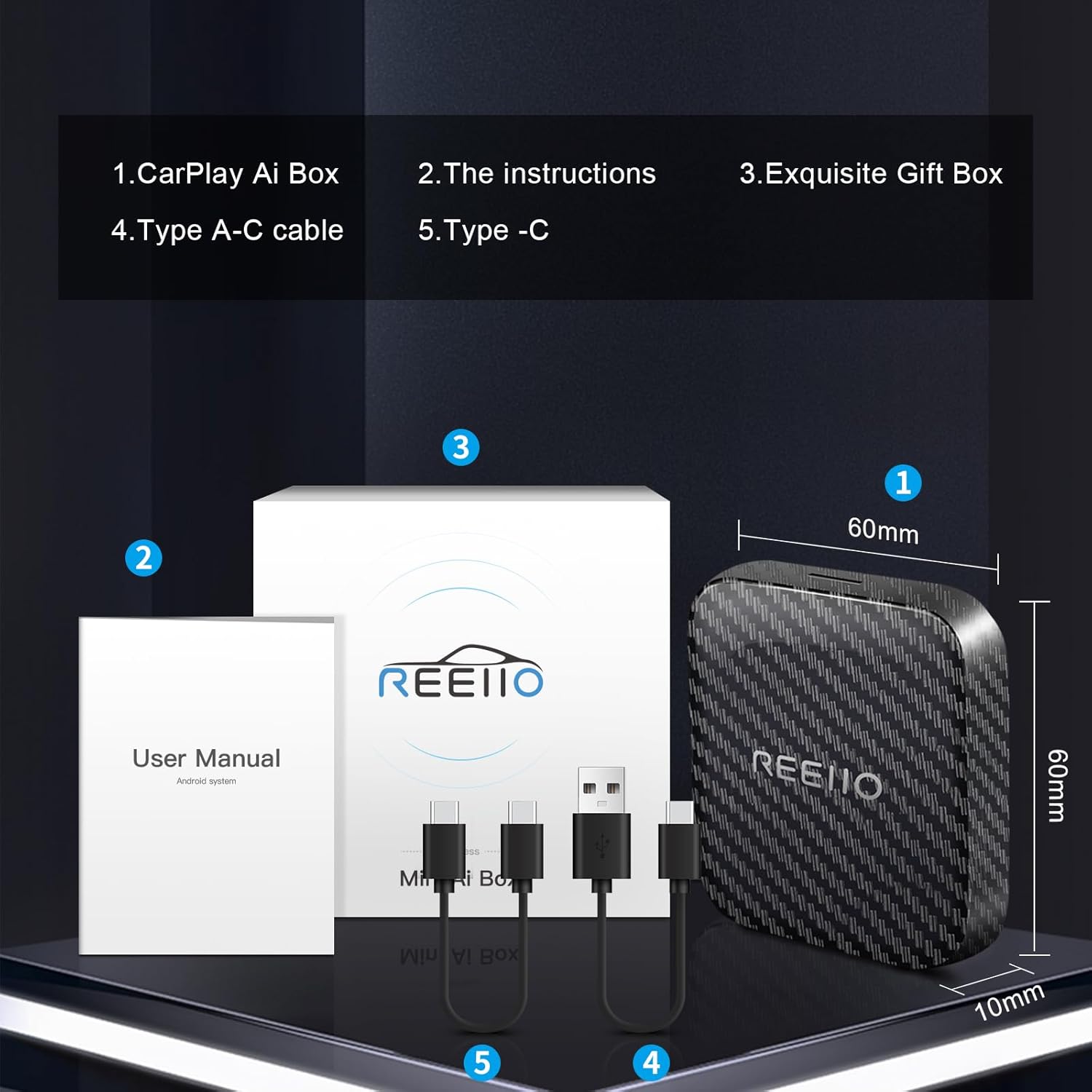 REEIIO Plug & Play Wireless CarPlay Ai Box * 1Brand Packaging Box * 1 Power Cable * 2User manual * 1