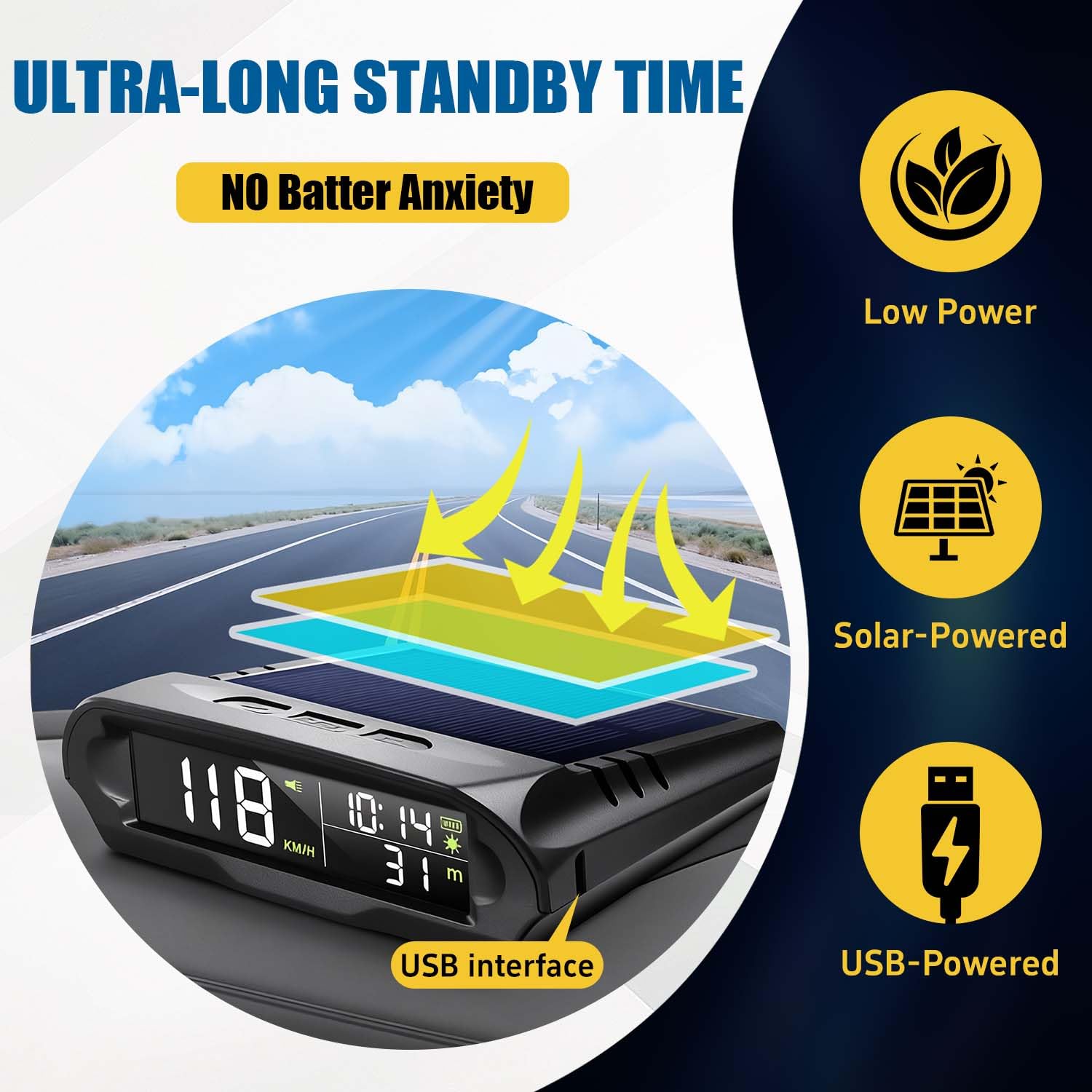 Multifunction HUD Display: Real-time projection of time, temperature, altitude, and speed with solar charging—stay fully informed about your vehicle’s status at a glance.