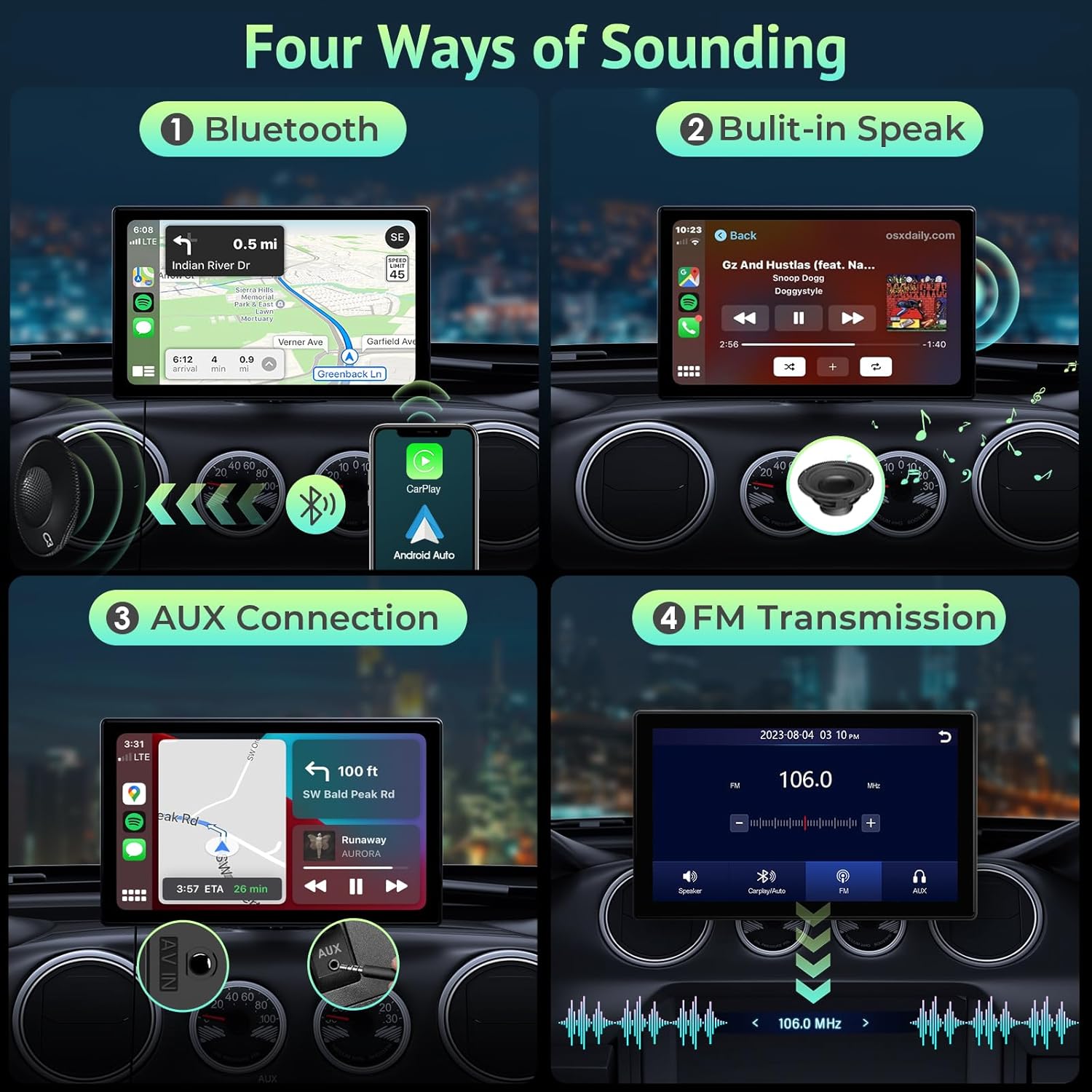 🚙【4 Ways Audio Output】: The Upgraded carplay screen can be wirelessly connected to the car stereo via Bluetooth on the phone, allowing you to enjoy high-quality sound without loss. The carplay box can also be connected to the car stereo through an AUX cable or transmitted through FM channels. In addition, there is a high-quality built-in speaker in the device, giving you four different ways to experience sound.