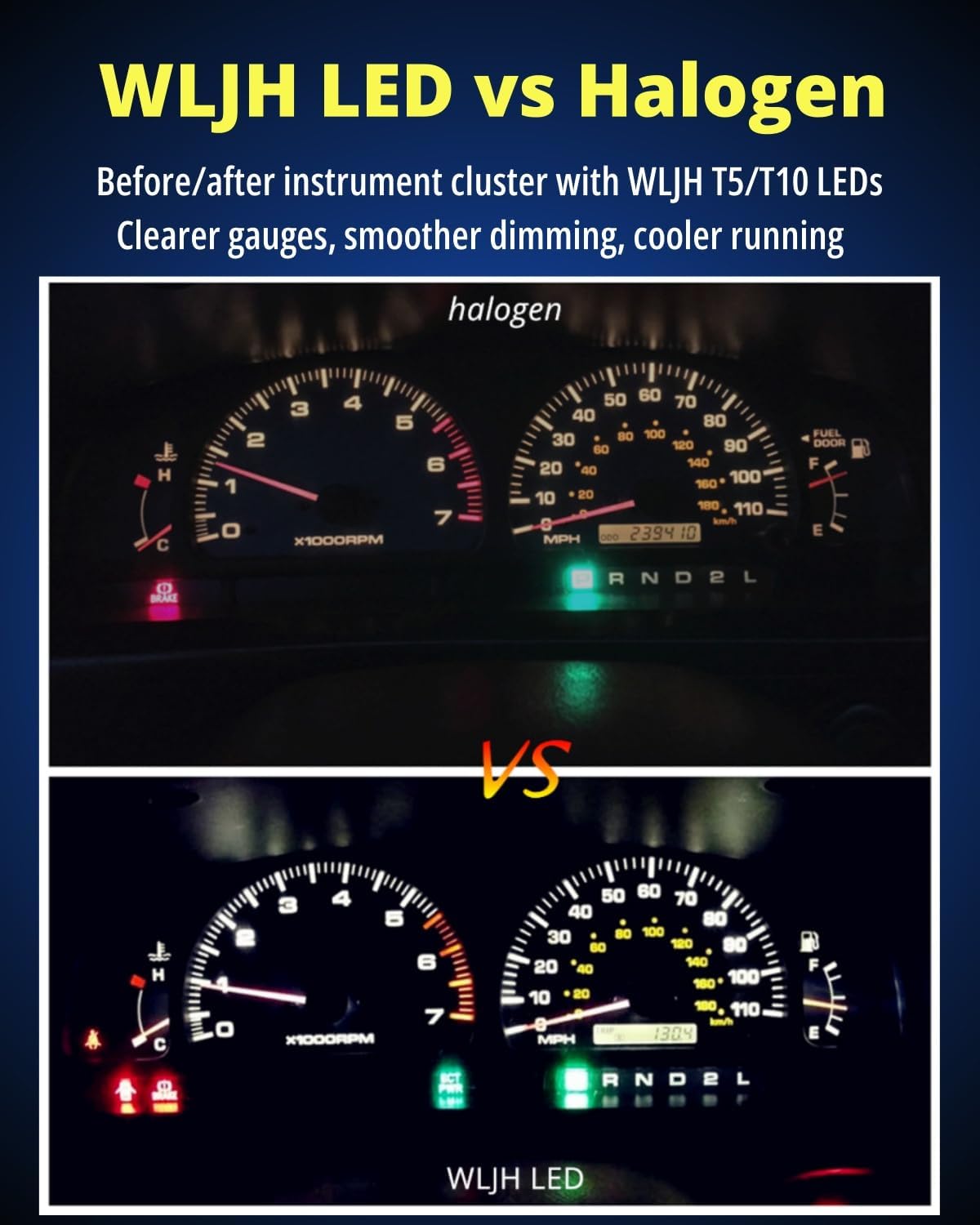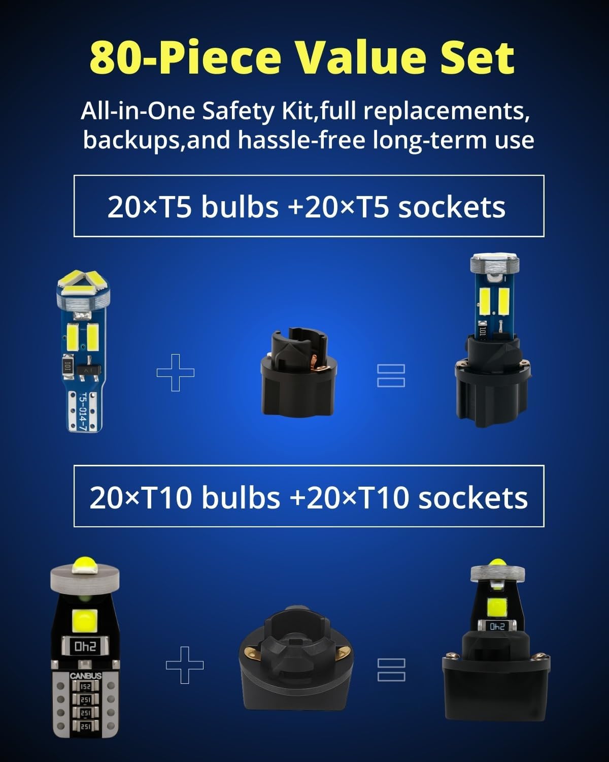 What You Get and Support :20× T10 Led + 20× T5 Led with twist sockets ( totally 80 pieces ) deliver full coverage for most position—perfect for full refresh, color matching, or spares; 50,000hrs Long Lifetime, backed by WLJH two-year support