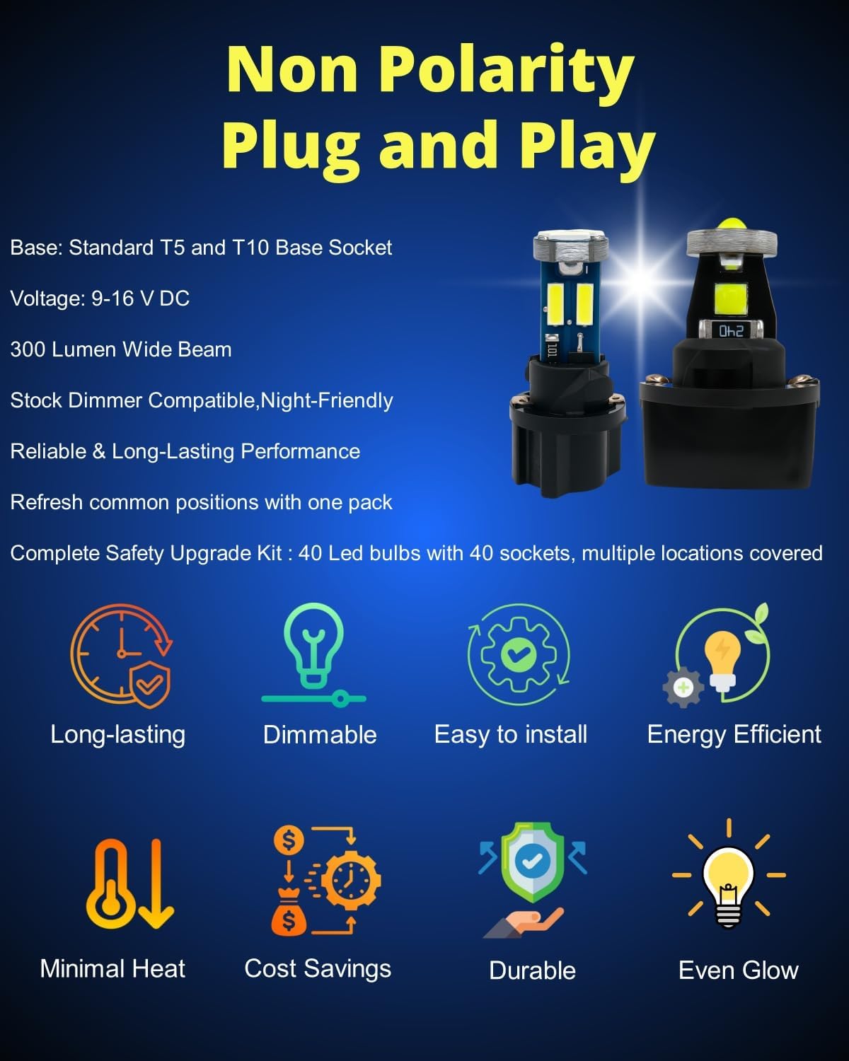 Plug-and-Play Non-Polarity: Install in 5 minutes, no wiring, no polarity flipping, quick DIY install protects clips and trims while saving time; Mixed T10 and T5 sizes cover common small sockets—remove, insert, and drive