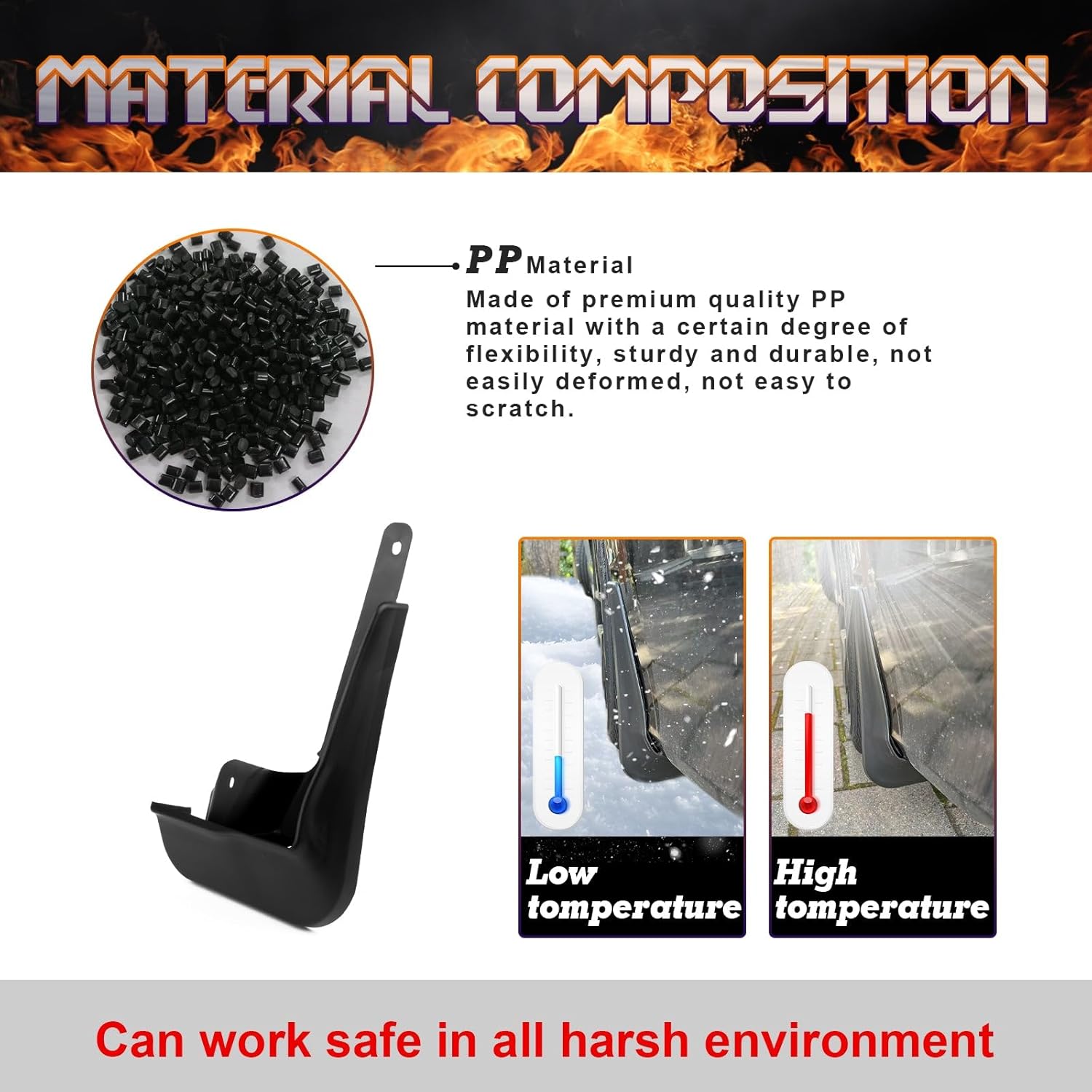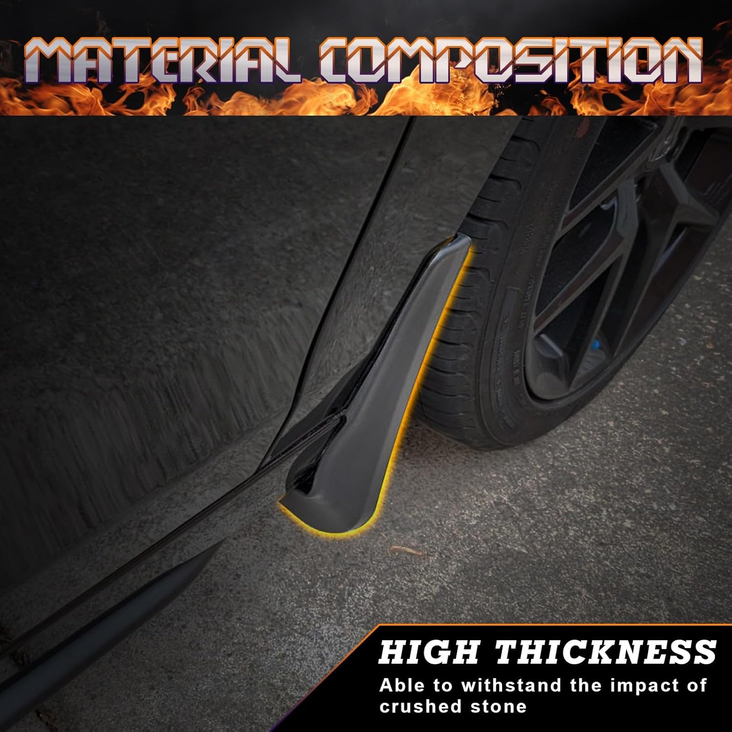 Tough textured finish that will hold up in the roughest conditionsGive your car a stylish and sporty looking in minutes by adding this splash guardIt is durable and long lasting during any weather situationEasy installation, direct Install in the original hole position with screws (Included in package), drilling is needed.Impervious to water, mud, snow, ice or rocks. will not fade even in the harshest sunny environments Package Includes