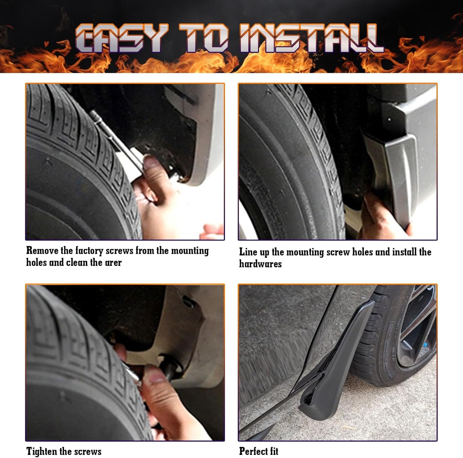 Easy to Install: No drilling required. Precision-designed original holes and tips to simplify installation without professional help. All mounting hardware are included in package. Just align the holes and screw in the screws. Please pay attention to the correct installation position should be at the rear of the tire