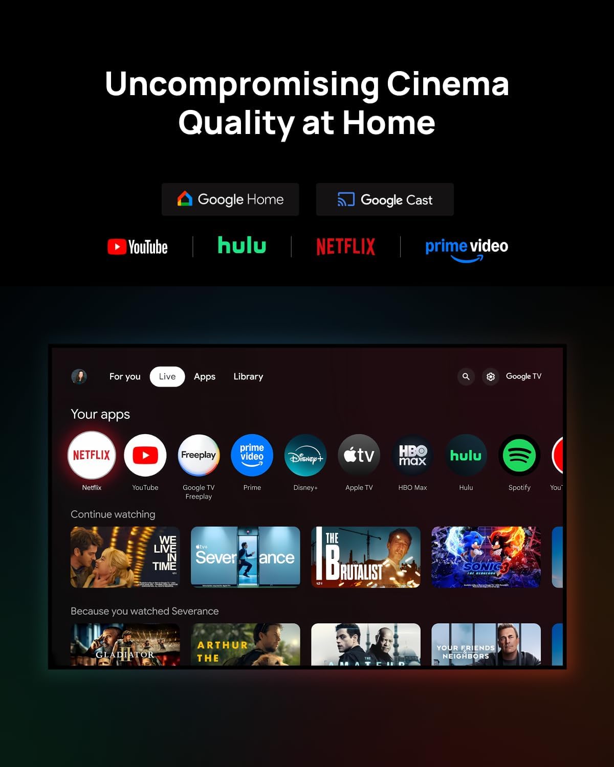 Google, Fully Integrated: With Google TV and Google Home built in, enjoy instant access to streaming apps and hands-free voice control—no extra devices or remotes required.