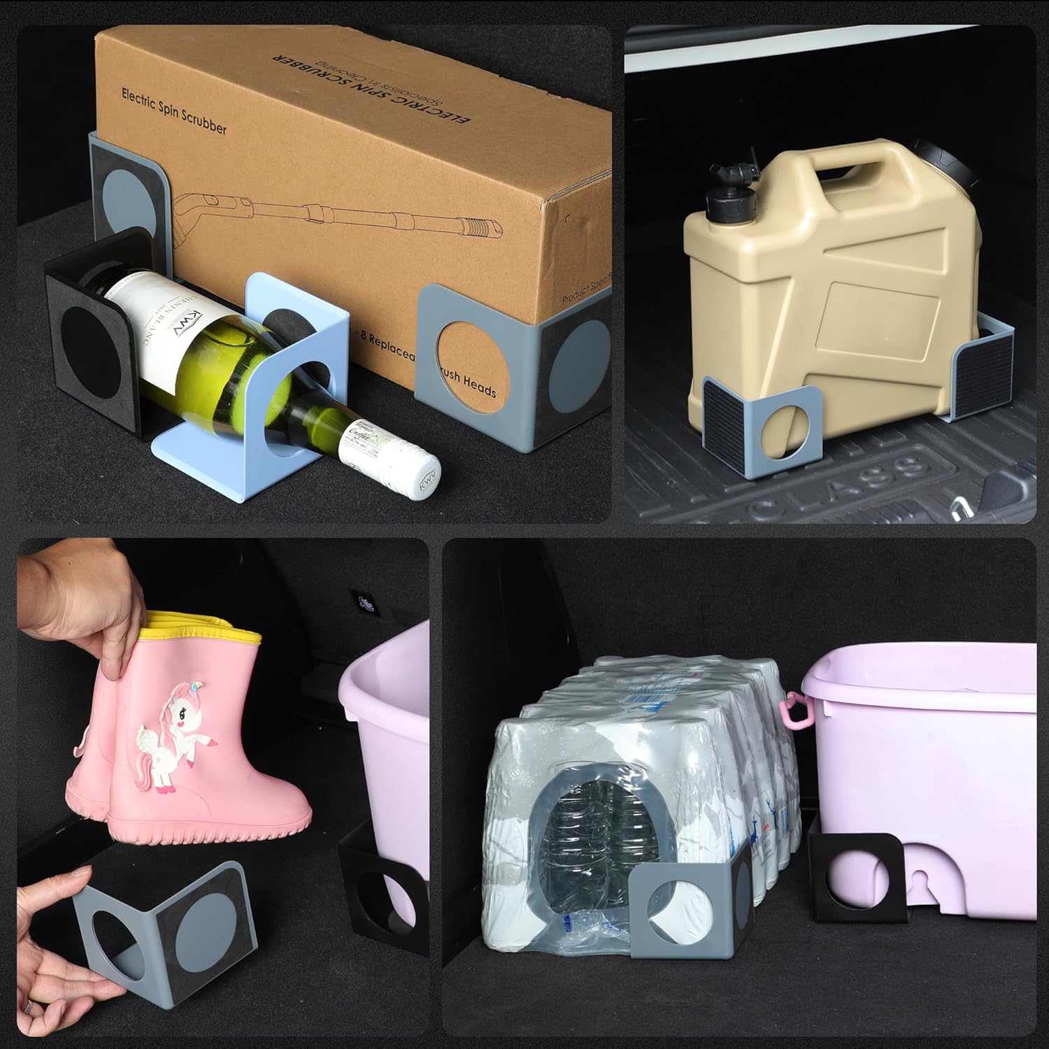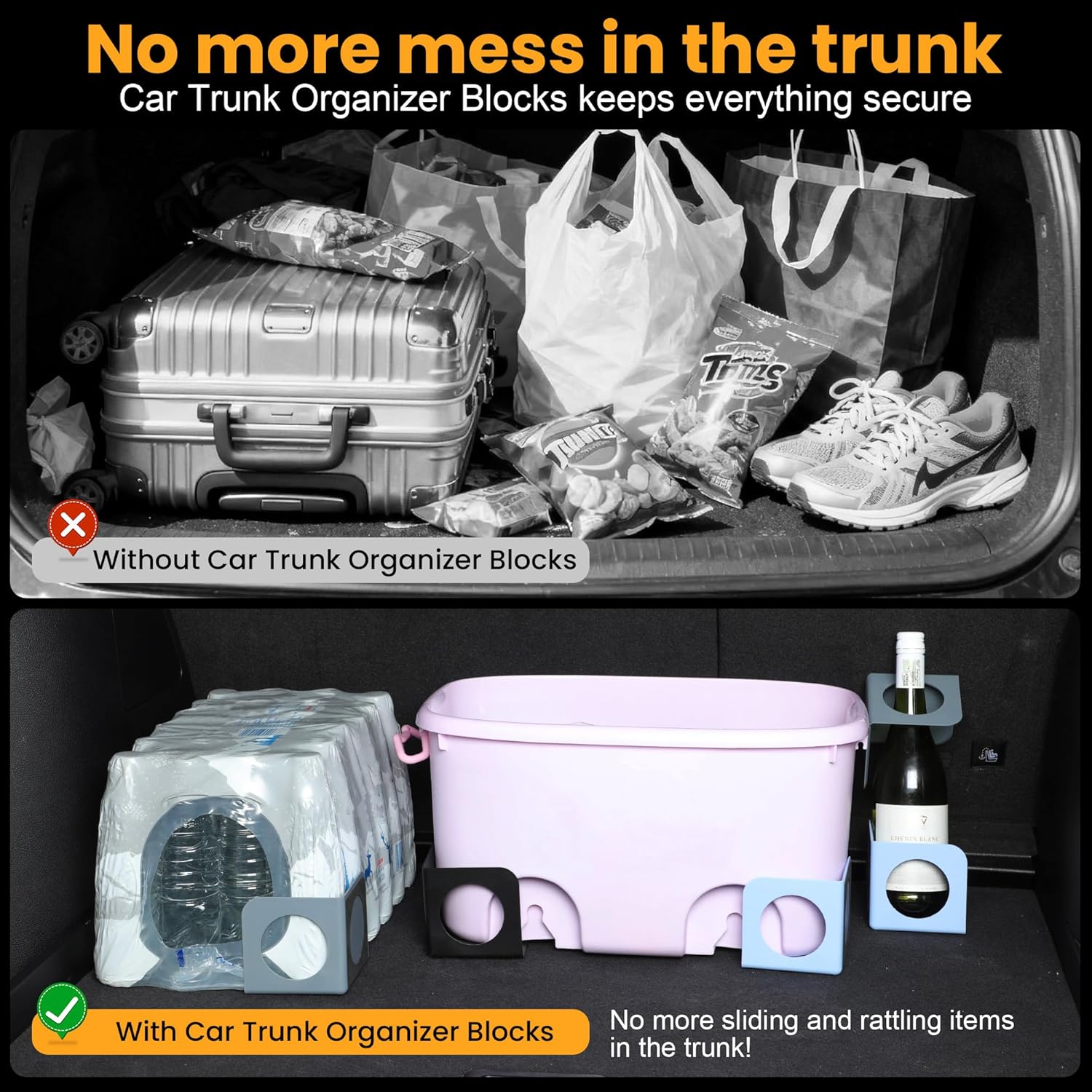 Make cluttered and noisy car trunks a thing of the past, the innovative trunk stabilizer. It keeps your belongings secure and your drives peaceful, ensuring luggage stays put during sharp turns or abrupt stops. XING WEI trunk organizer blocks offers flexible placement options and a circle-shaped hook for securing long or oddly shaped objects. Keep your belongings safe and organized effortlessly.