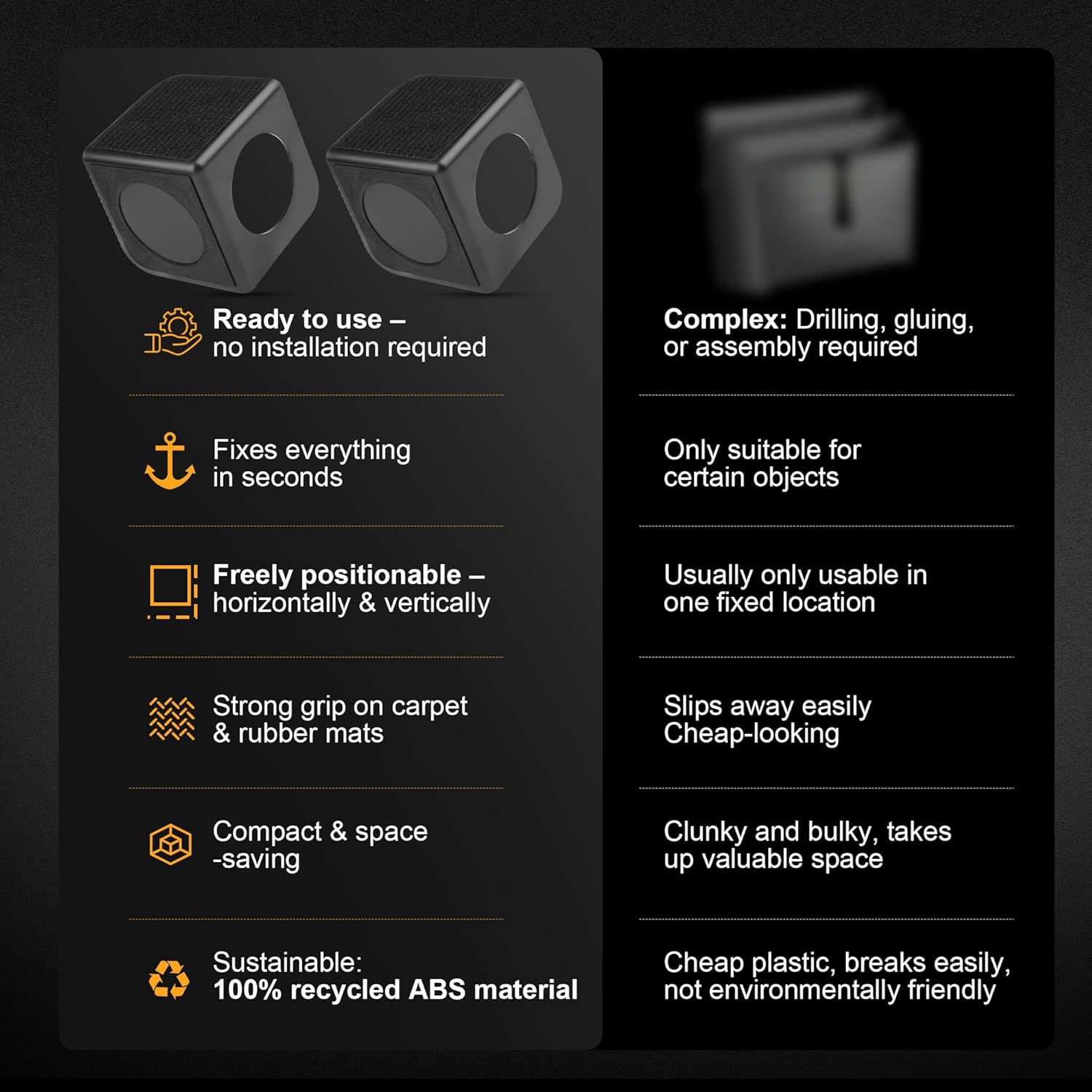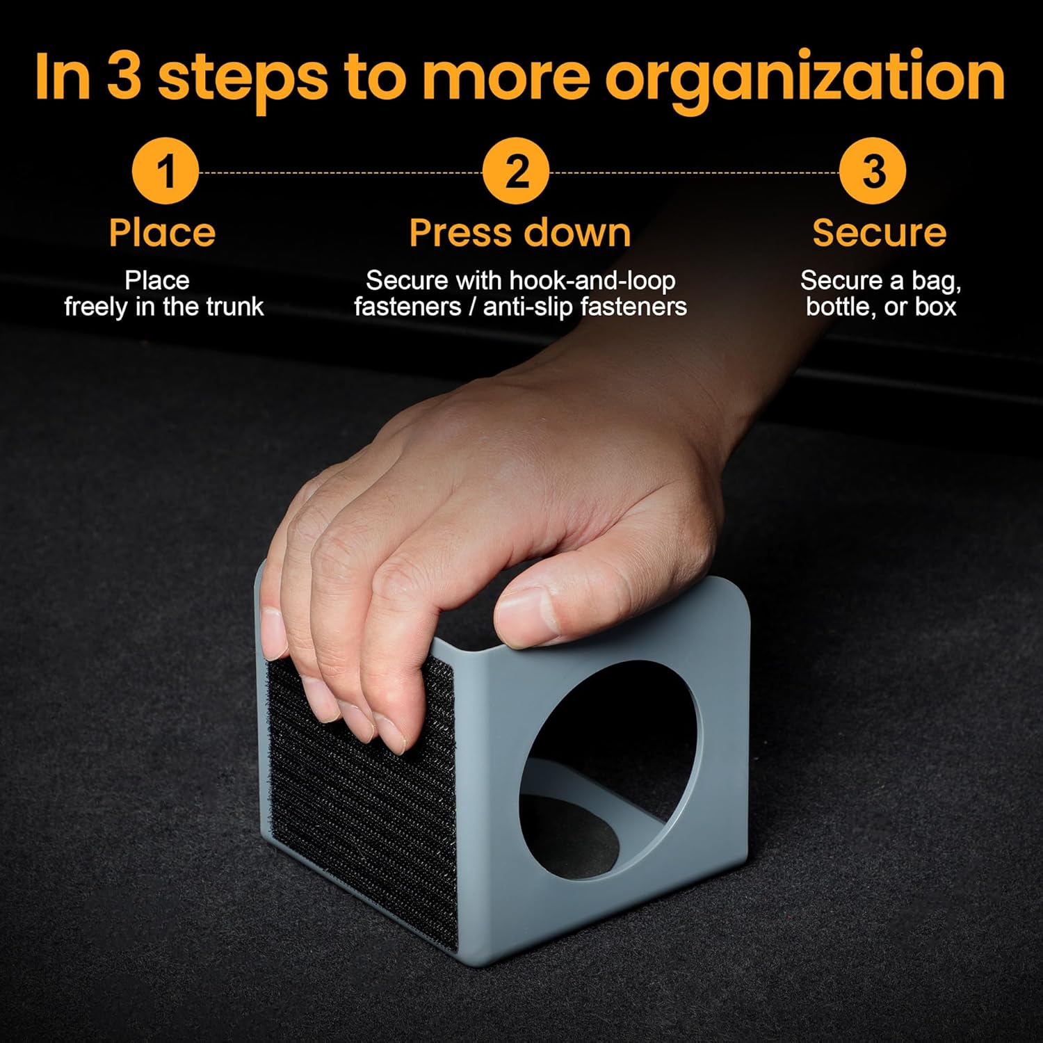 I had my doubts about these organizer blocks, because I have a rubber mat, not carpet. I bet the Velcro works really well on carpet. But with my rubber mats I can not test that. So, when you lay these cubes on the correct side against the rubber floor mat, they really do keep things from moving around.If you look at the pictures I added, you will see two fairly heavy boxes of canned products. I used the two cubes on one side and pushed them against the boarder of the OEM trunk organizer that I have. Then I left them there and drove around here and there over the next three days. These buggers did not move an inch.Same with some groceries I had, but neglected to get pictures. I think the key is to use the non slip pad against the floor or car mat.I may actually get another set to help with grocery trips. Would recommend.