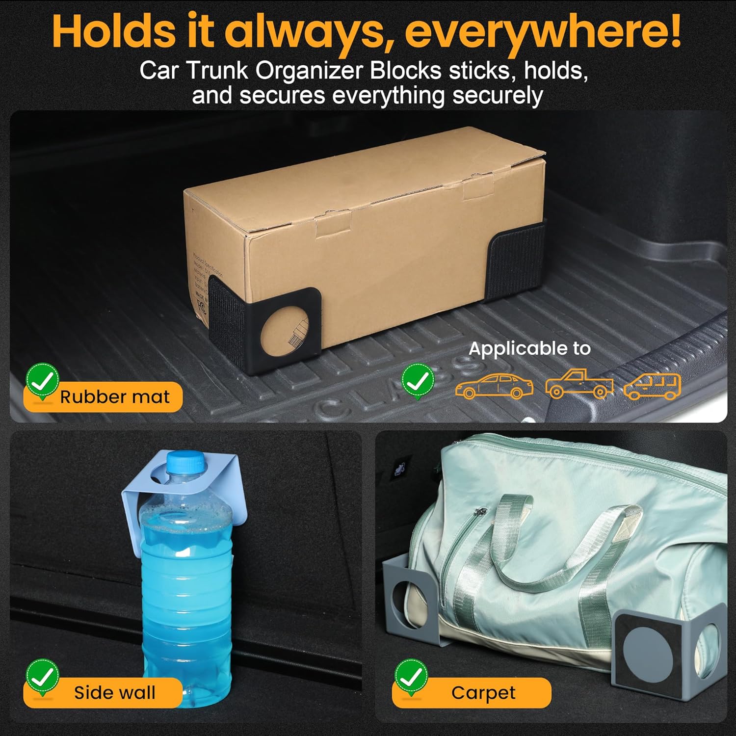 XING WEI trunk organizer blocks ensures unmatched stability in your car trunk. With strong velcro on one side, it easily secures to the trunk sides, providing a reliable grip even during sharp turns. The sturdy anti-slip pads on the other side stick firmly to the trunk floor, preventing movement. Compatible with various trunk surfaces.