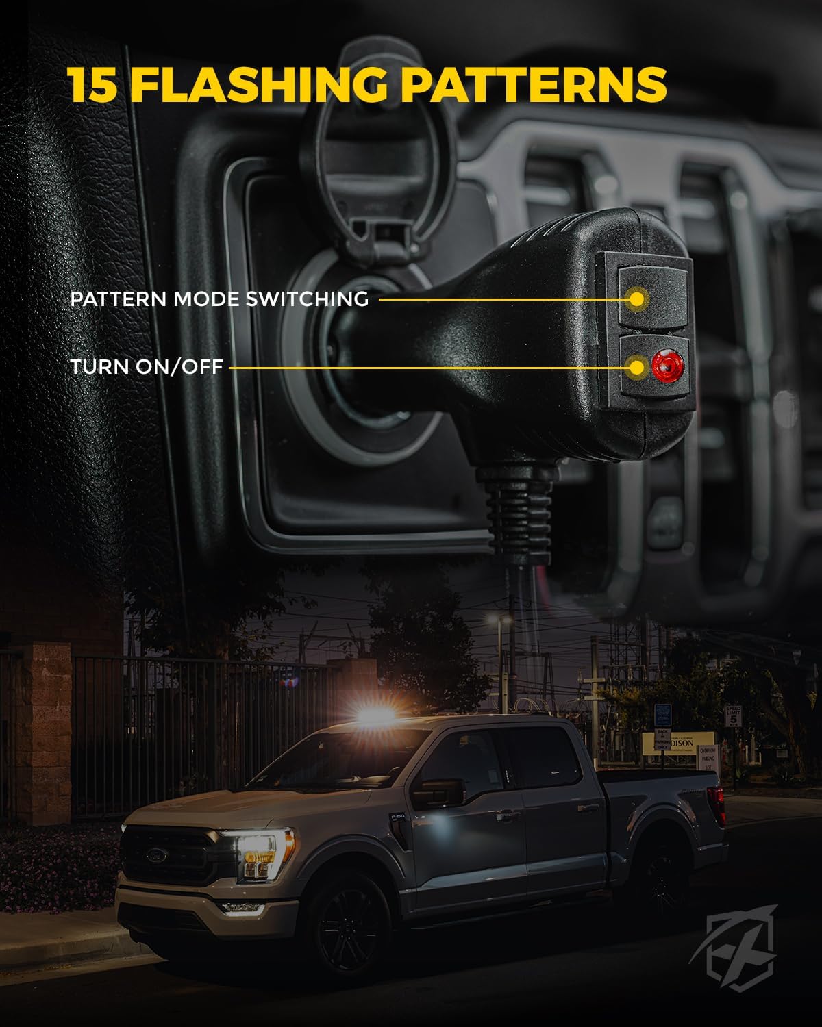 15 STROBE FLASH PATTERNS – 12V cigarrette plug with convenient dual switch design. 1 for easy power on/off. 2nd to change between 15 different flash modes, includes last pattern memory recall. Patterns include Rotating, Flashing, Alternating Between Left and Right Side, etc. These modes are sure to provide caution to potential upcoming hazards.