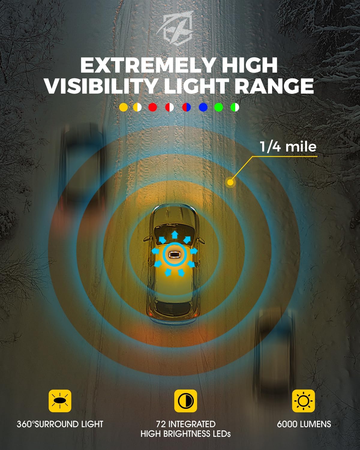 POWERFUL MAGNETIC BASE FOR EASY INSTALL – 2 pods with a total of 12 magnets, with protective rubber feet. Place on any vehicle metal rooftop. 10FT straight power cable.