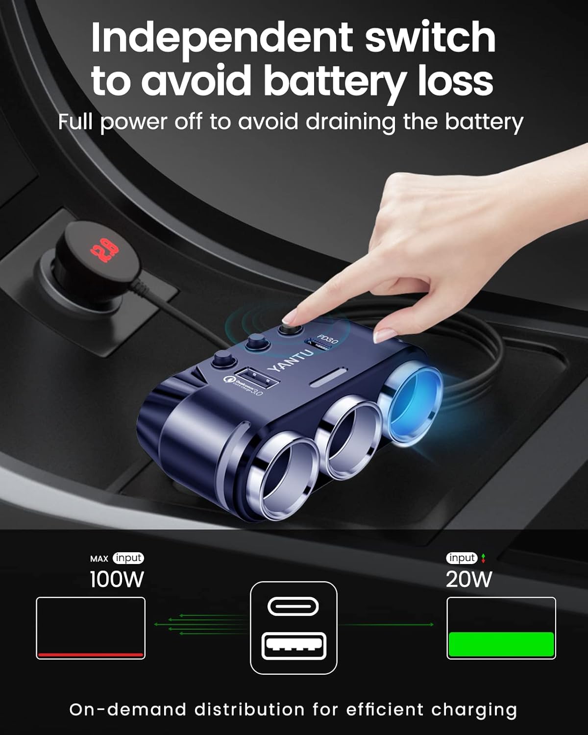 【Safety System & Independent Power Switches in Cigarette Lighter Adapter】 Ensure the safety of your devices with the Cigarette Lighter Adapter that features independent power switches on each socket. The Cigarette Lighter Splitter is equipped with a built-in safe fuse and smart recognition chip to prevent over-current, over-voltage, and short-circuits. Trust this reliable and secure Cigarette Lighter Adapter to keep your devices powered and protected.