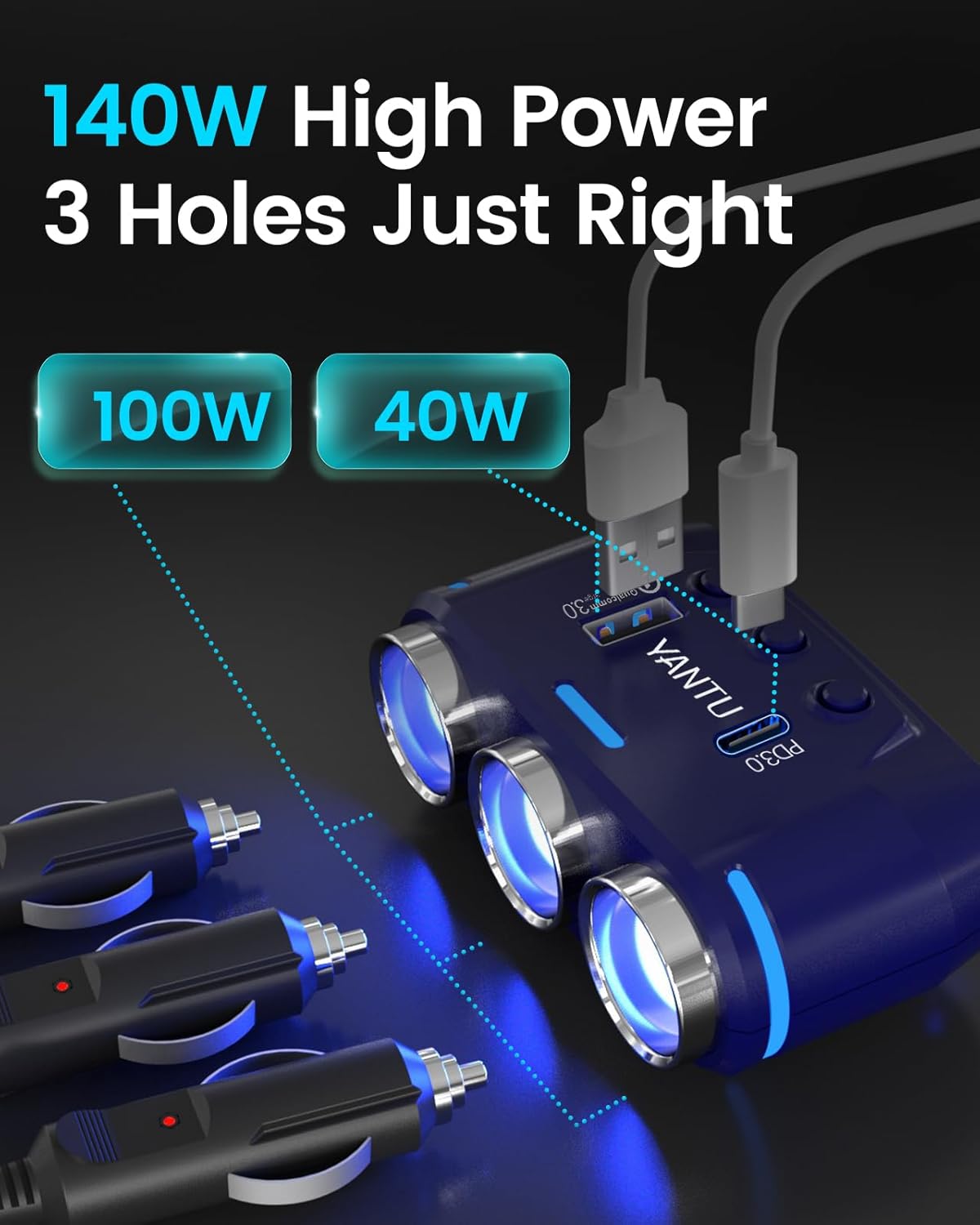 YANTU QC3.0&PD 40W Cigarette Lighter Adapter, 3-Socket 140W Cigarette Lighter Splitter with 12v USB Outlet,Car Charger Adapter with Double/Dual/USB C Charger Multi Port/Plug Outlet for Car Devices