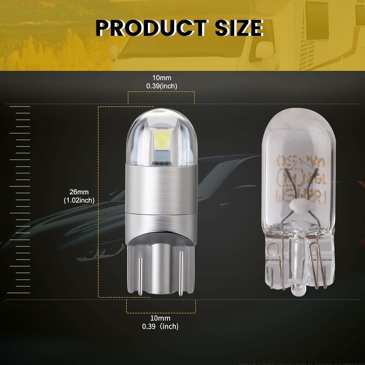 Très bonnes ampoules LED T10 ! L’éclairage est puissant, clair et homogène, et elles apportent une vraie différence par rapport aux ampoules halogènes classiques. Leur intensité offre une meilleure visibilité tout en consommant très peu d’énergie, ce qui est parfait pour l’éclairage intérieur, les répétiteurs de clignotants ou les plaques d’immatriculation.L’installation est ultra simple — plug & play —, et elles s’adaptent parfaitement à la plupart des supports T10 sans aucun jeu. La qualité de fabrication est au rendez-vous, avec un bon dissipateur thermique et une durée de vie prometteuse.Excellent rapport qualité-prix, je les recommande à ceux qui veulent moderniser l’éclairage de leur véhicule facilement et efficacement.