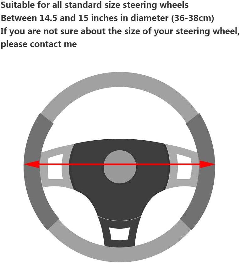 Universal Fit: This car steering wheel cover suitable for size steering wheels from 14.5″ to 15″ (37 cm to 38 cm) in diameter.Universal size fits for most Vehicles, Sedans, SUVS, Vans, Trucks.