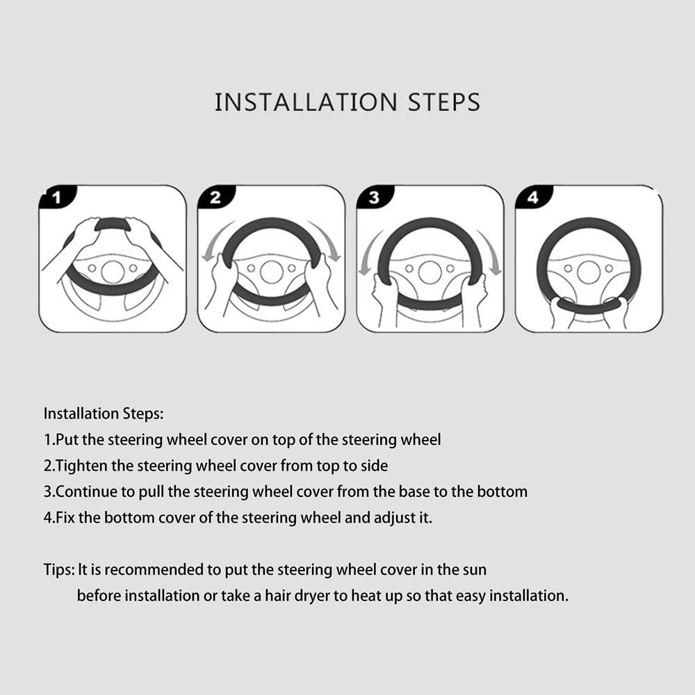 Easy To Install: This steering wheel cover is easy to install.Simply slip it right on to your steering wheel and your good to go. Just place the cover on top of the steering wheel. Press and hold the upper part of the cover and gradually lower it with both hands on either side to tighten.