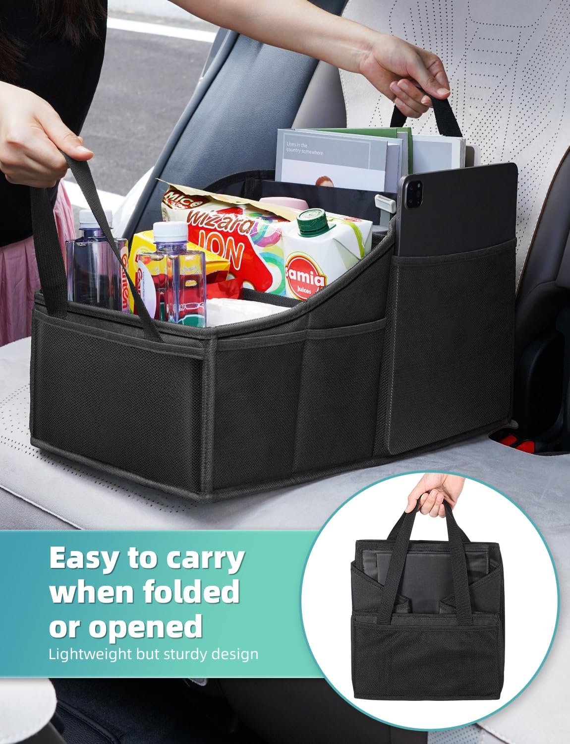 Take in, take out, foldable – thanks to two reinforced handles, you can easily take this car seat organizer front seat from your car to your home or office; you can also fold it into a flat portable bag when not in use to save space