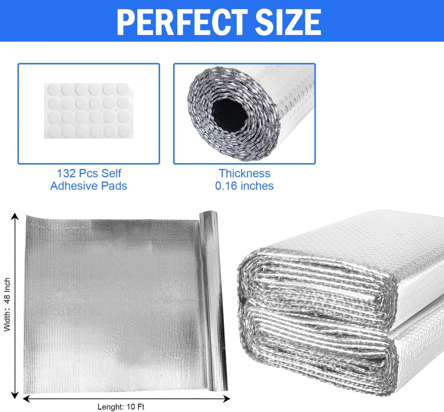 Double Reflective Insulation Sheet: You will receive 48 inch x 10 FT reflective foil insulation and it comes with 132 pairs of self-adhesive pads for better installation and fixation to prevent falling off