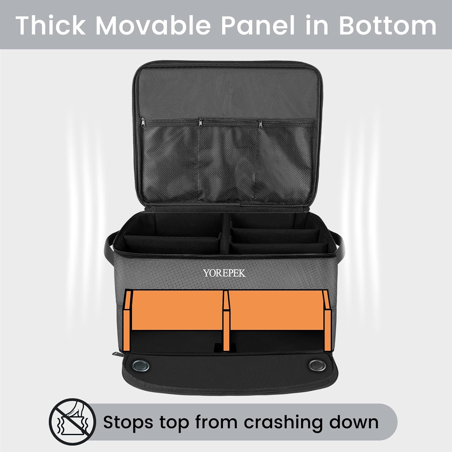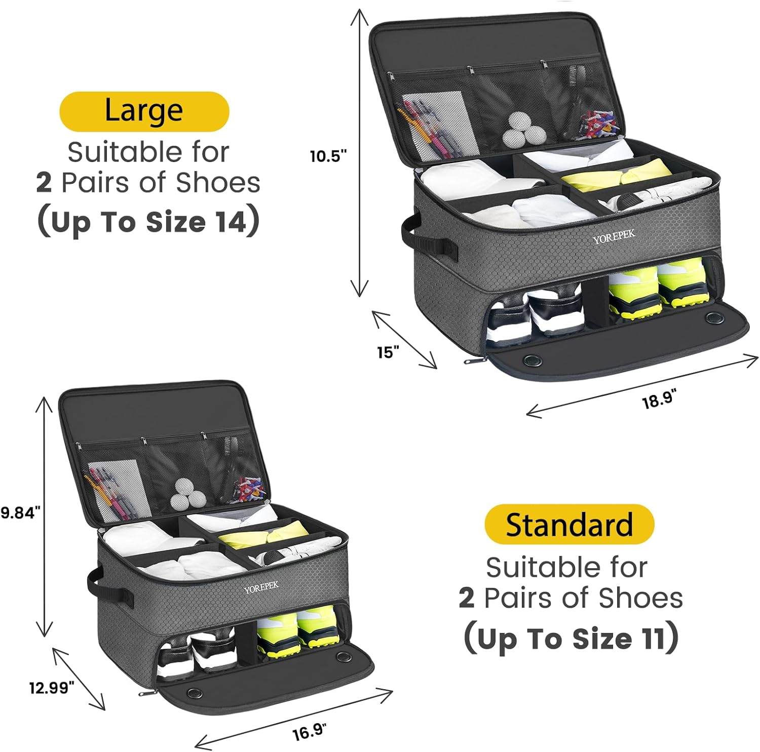 SEPARATE STORAGE FOR 2 SHOES: YOREPEK golf trunk organizer for car is upgraded on storage compartments, having separate shoes compartment on the bottom layer, to store 2 pairs of shoes up to size 14 The bottom compartment is with ventilated holes to keep air flowing around shoes; And the bottom storage space is made of polyester, which is easy to clean