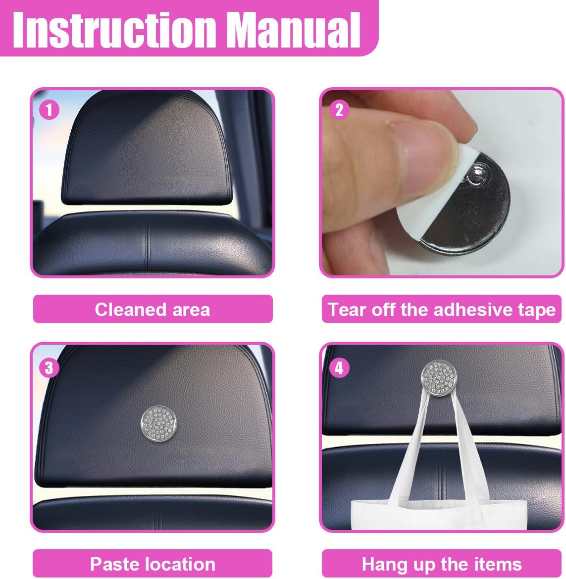 【Easy to Install】: This rhinestone car hook is easy to install. First, clean and dry the installation surface. Then, peel off the adhesive protective film on the back of the hook, stick it on, and press it with your hand for reinforcement. It has strong stickiness, good load-bearing capacity, is installed stably without falling off, leaves no traces when removed, and will not damage the car interior.