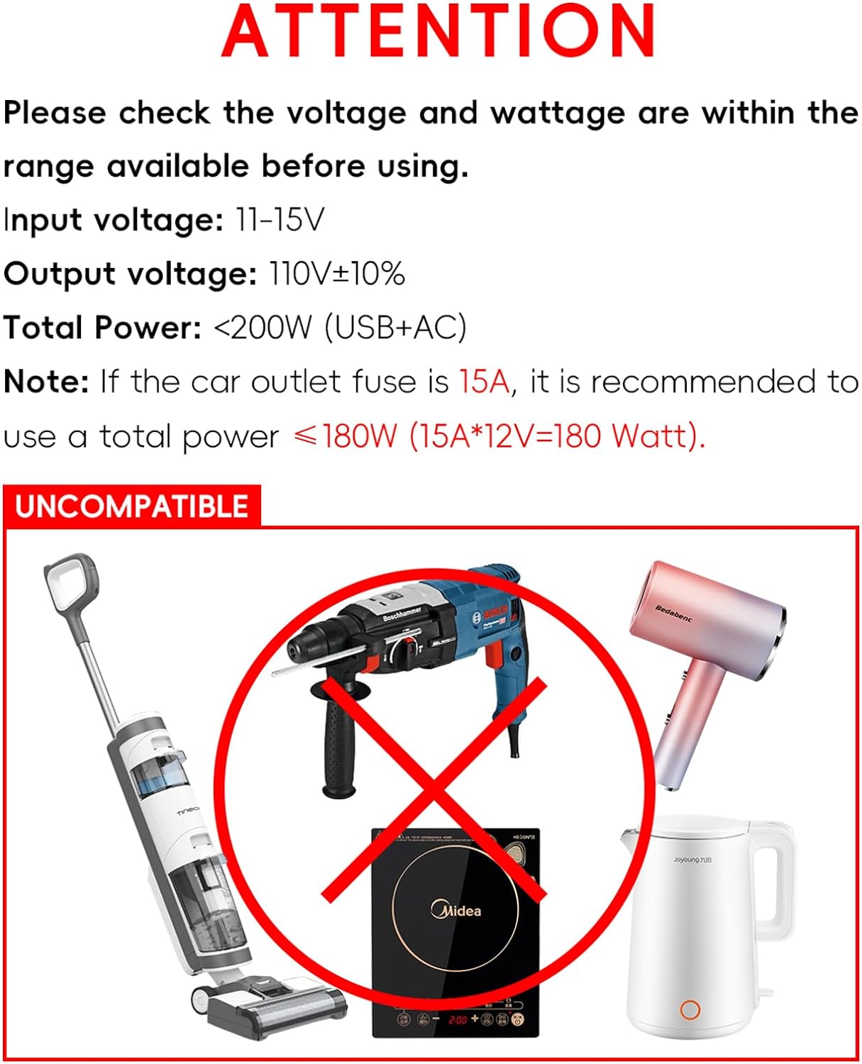 2.Before using, please verify the power requirements of your electronic devices. The inverter is a repair sine wave, not applicable to the following appliances: curling iron, vacuum cleaner, electric rotary, induction cooker, rice cooker, kettle, etc., because the starting power of these appliances is often several times or even more than ten times of the rated power