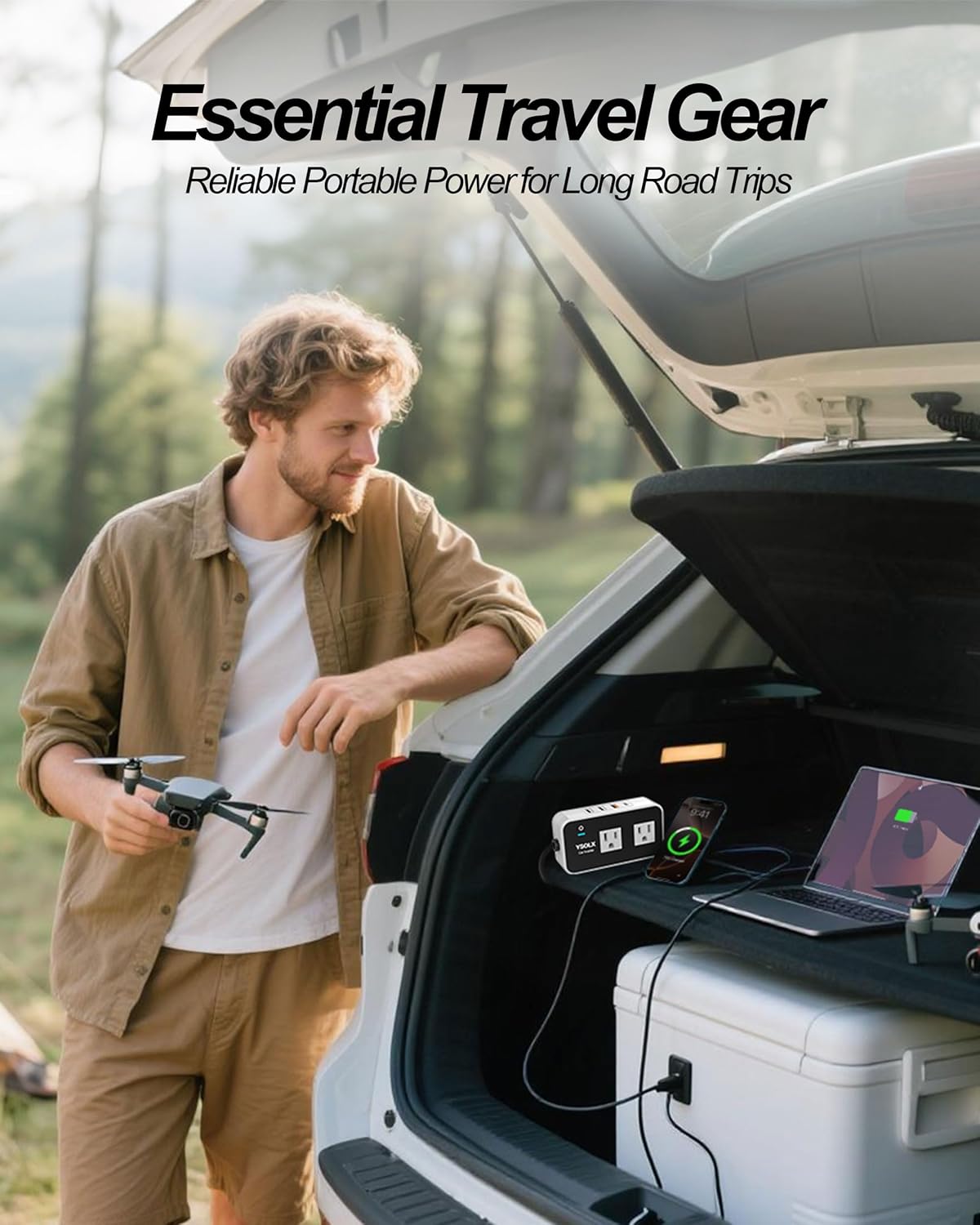 【Portable and Fast】 The car charɡer adapter is only the size of a mobile phone (5×2.7×1.4 inches, 8.5 oz+), equipped with USB-QC (18W), USB-C (20W), 110V AC Outlet, which can quickly charge electronics, making travel, camping and work more convenient.