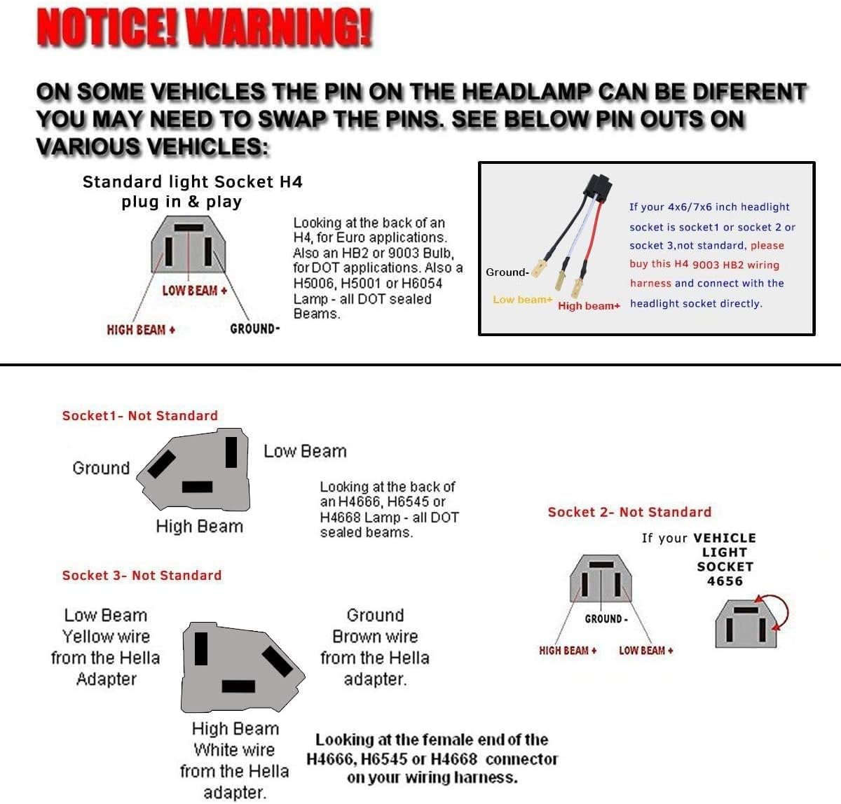 Excellent Compatibility: Universal fit for most vehicles with 4×6 headlights, including sedans, light SUVs and trucks, RV, motorcycles and off-road vehicles. Compatible with headlights: H4651 / H4652 / H4656 / H4666 / H6545. Note: Please check the measurement/size before you purchase these lights. They WON’T fit for the truck with 5×7 or 7×6 inch H6054 headlights.