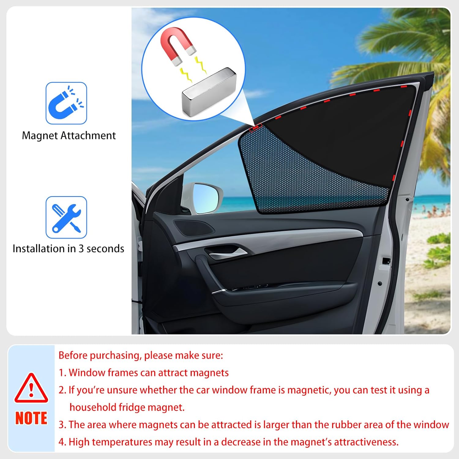 【Universal Fit for Most Vehicle】 Our car side window sun shade is designed to fit most car models, but not a 100% perfect fit. Before purchasing, please confirm that your car windows can be attracted magnets. We recommend testing your car window with a magnet. If it doesn’t attract, this car window sun blocker is not suitable for your vehicle