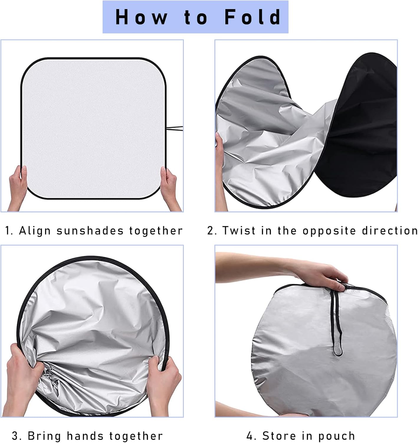 【Material】: The silver side uses a sun-blocking screen saver, which effectively reflects UV rays and sunlight. The black side can isolate heat transfer and reduce the temperature inside the car. Our car windshield visor can provide you with a cool driving environment.
