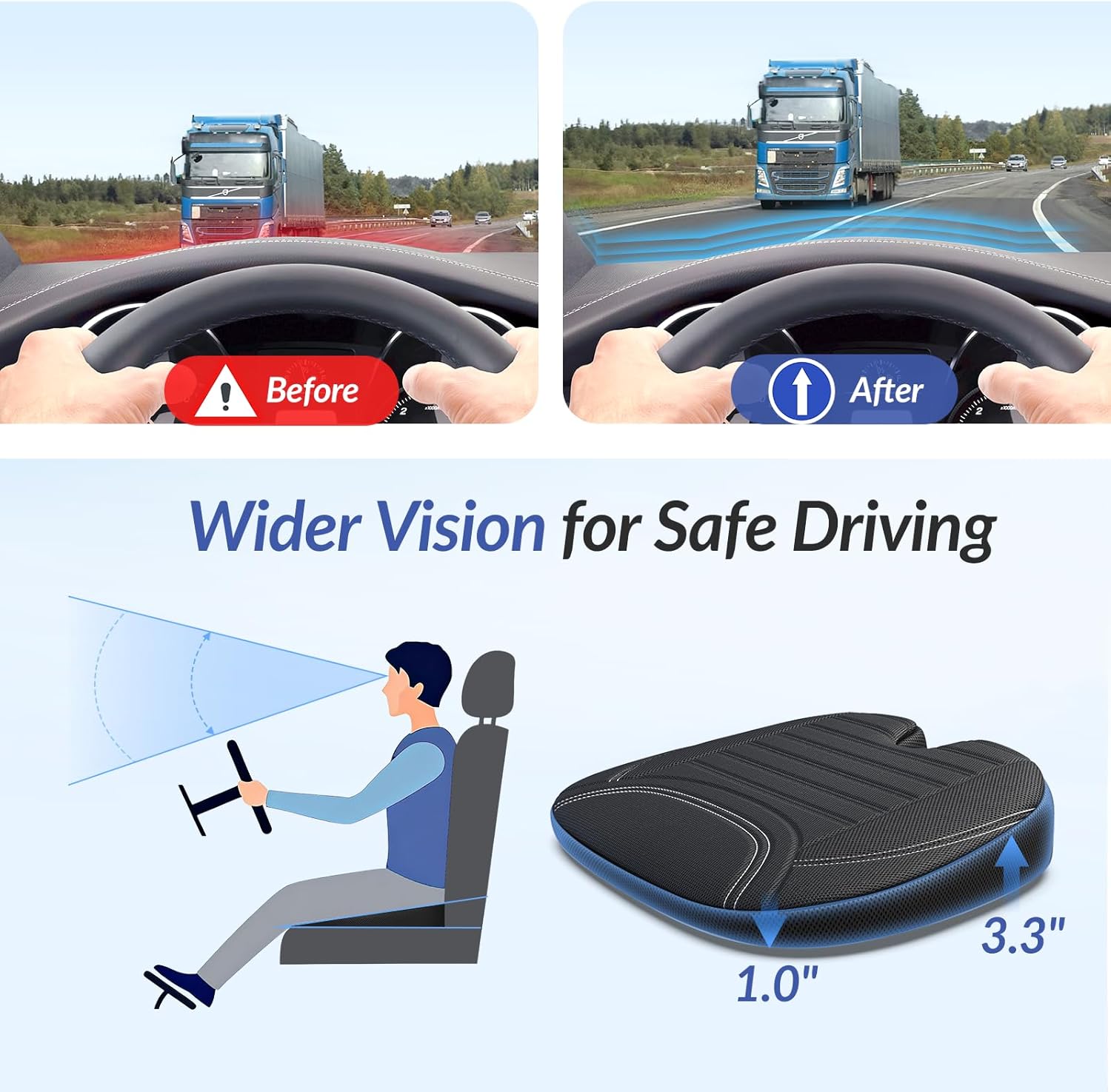 This makes driving safer for me. I am short and needed to get a lift in the seat so I can see over the wheel. I feel so much safer using this cushion. It is also comfortable, lightweight and breathable. Well worth it.