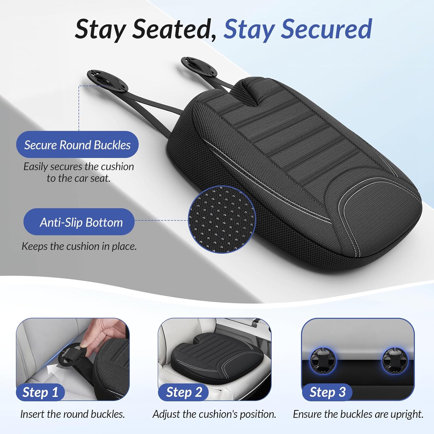 Premium Quality for Long-Lasting Use: The mesh fabric cover of this chair cushion not only delivers ventilated and breathable comfort while driving but is also machine-washable for effortless cleaning and lasting freshness. The secure round buckles make it easy to fix the cushion into car seats. The anti-slip bottom ensures that the car cushion stays securely in place, making it more stable. Note: the memory foam core is not washable