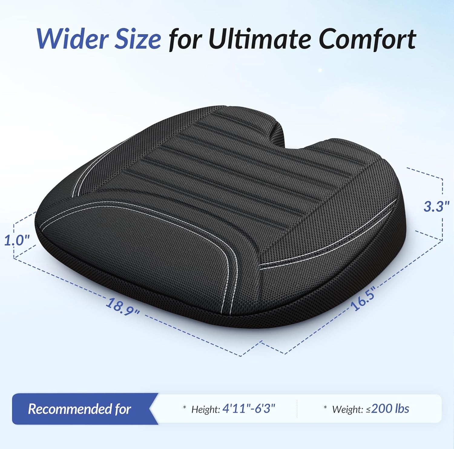 High-Density Memory Foam for Balanced Softness and Support: This memory foam seat cushion uses high-density memory foam to offer balanced softness and support, conforming to body contour while providing enough support by maintaining its shape. Recommended for individuals between 4’11” and 6’1″ in height and weighing under 200 lbs (support performance may vary outside this range)