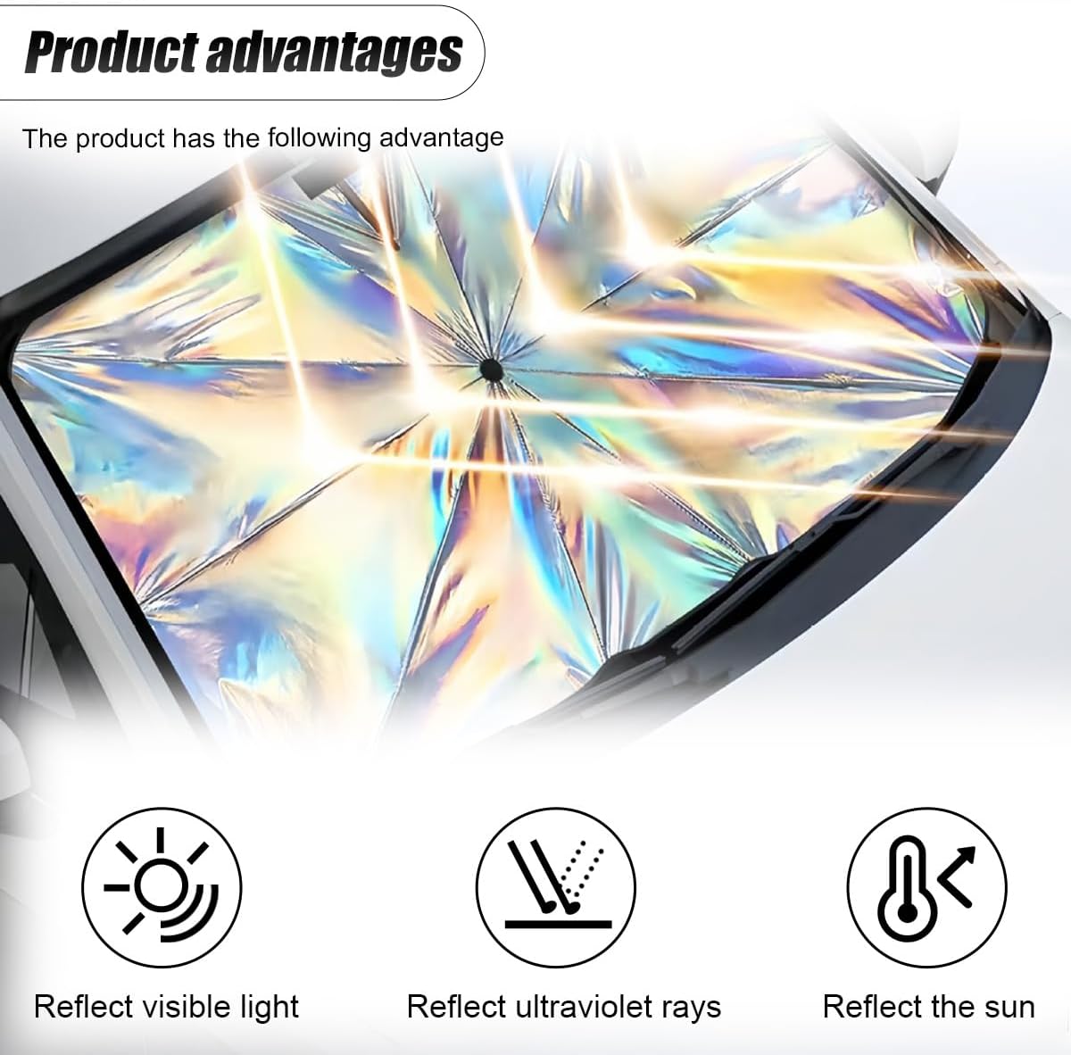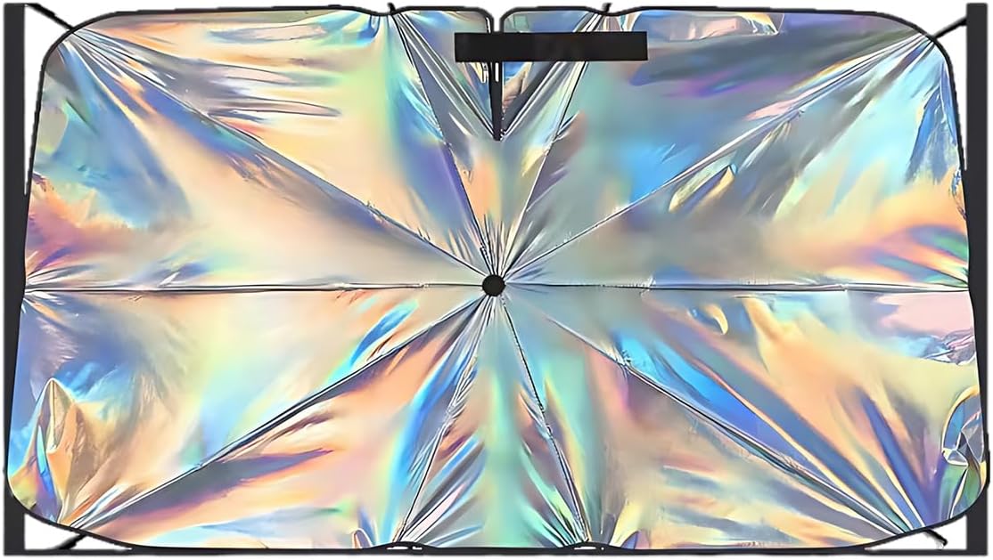 Fits my car window well and the rainbow effect is as pictured. I do think the sun protection is good – it seems to work better at keeping my car cooler than other sun protectors I have had. I’m not sure how long the umbrella infrastructure parts will hold up – it is mostly plastic and seems sort of flimsy. I’m very careful opening and closing it as it seems like it will break otherwise. For the price, I wish the umbrella ribs and handle were sturdier.