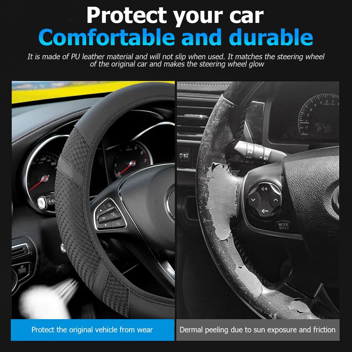 -Anti-Slip Function: The surface of the leather has been specially treated with anti-slip properties to ensure a firm grip on the steering wheel during driving and improve safety.