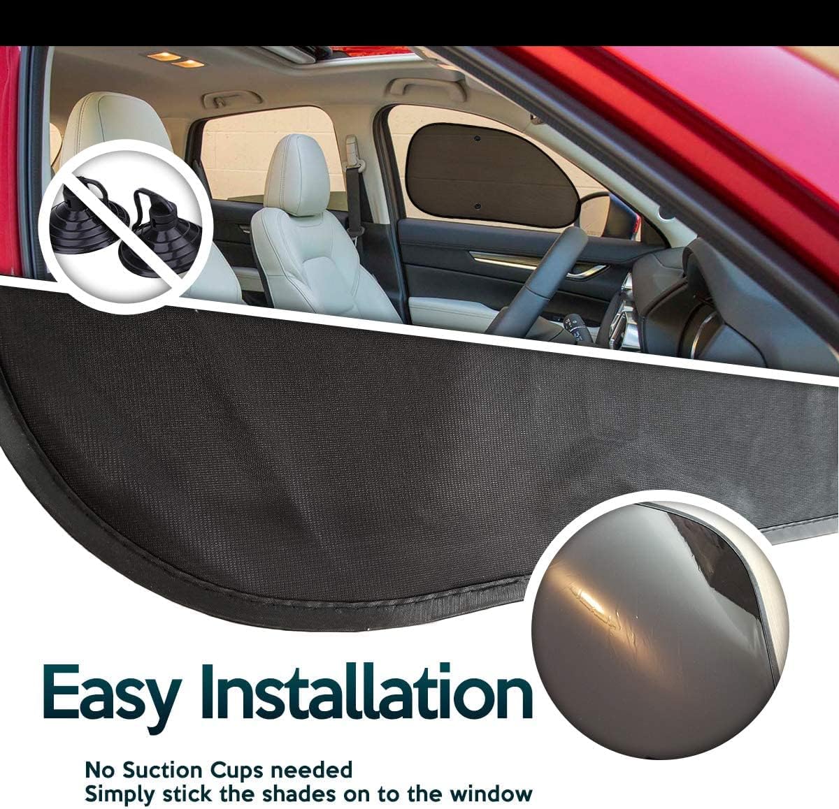 ► EASY TO INSTALL – The Zone Tech side window sun shades is easy to install and brings no harm to your car window. They hold the shades in place perfectly. The suction cups on the top portion have a sideward slit in them about 50% of the way into the top portion, then at the end of the slit there is a square notch at the end or at the dead center. This allows you to put the wire edge of the shade into the suction cup too.